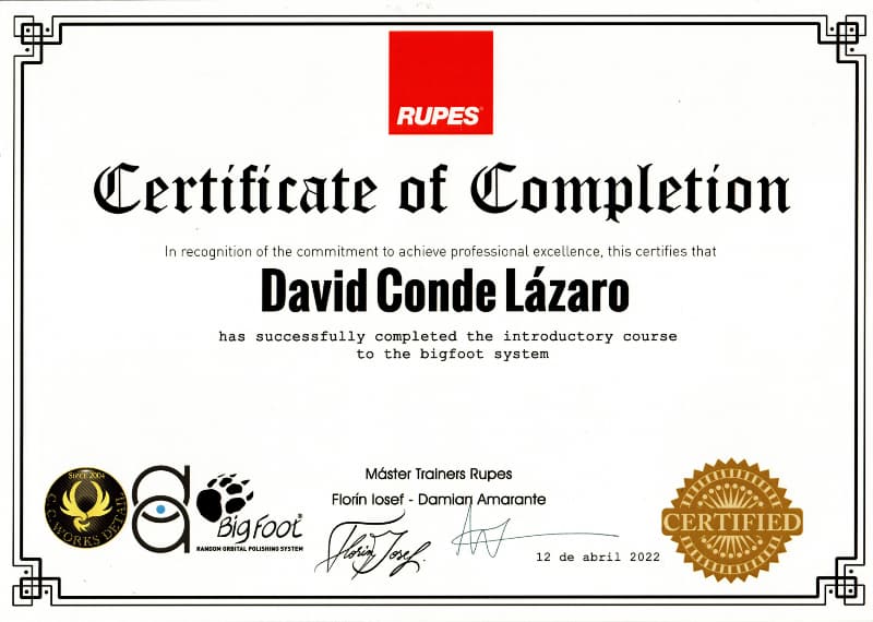 En 2022 se certifica en el sistema BigFoot de Rupes con un curso avanzado de la mano de Florin loset y Damian Amarante.